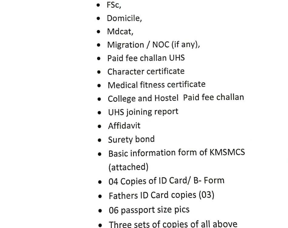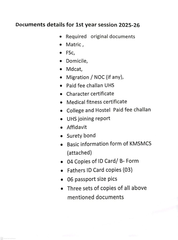 DOCUMENTS REQUIRED FOR THE ADMISSION Of M.B.B.S 1ST YEAR (Session 2020-21)